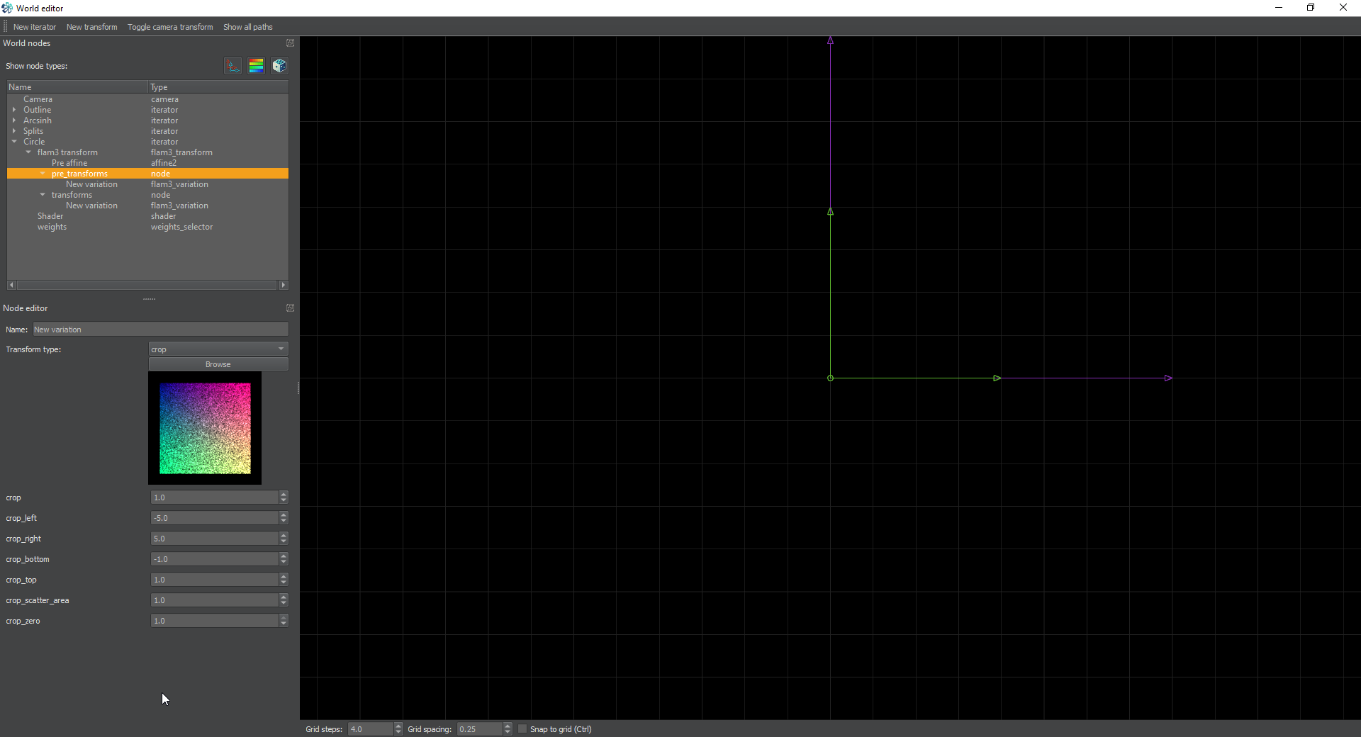 Similar to other tutorials, we’re going to create a circle out of this. However, for this one we’re going to use an iterator instead of a camera setup. Start by creating a new iterator and setting it’s transform to linear. We’re not going to make it do anything other than wrap the previous set of iterators into a circle, so setting it to linear is like telling the fractal that we’re going to take everything and start translating it, but if we don’t move the pre-affine, nothing happens beyond what we do in the pre and post transforms. If you think that’s complicated, just set it up and play with it and you should get the general idea.